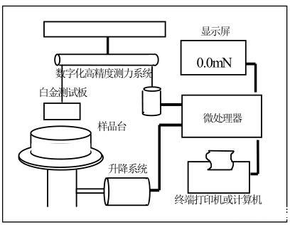 當白金板接觸到樣品液后,樣品液的表面張力會將白金板往下拉。基于高精度電子天平的數字化檢測系統(tǒng)檢測到這個微小的力并傳到微處理機進行處理。