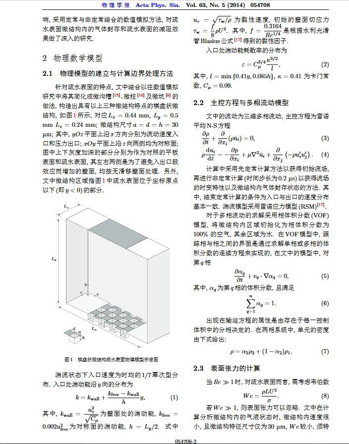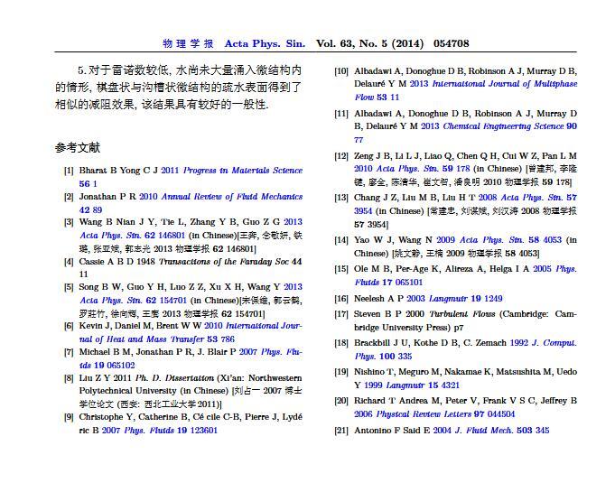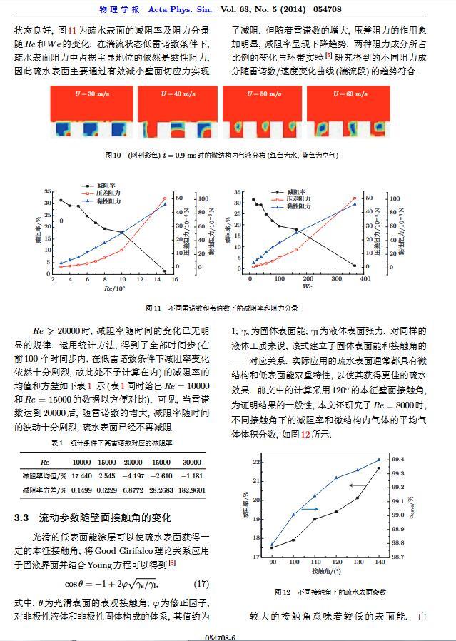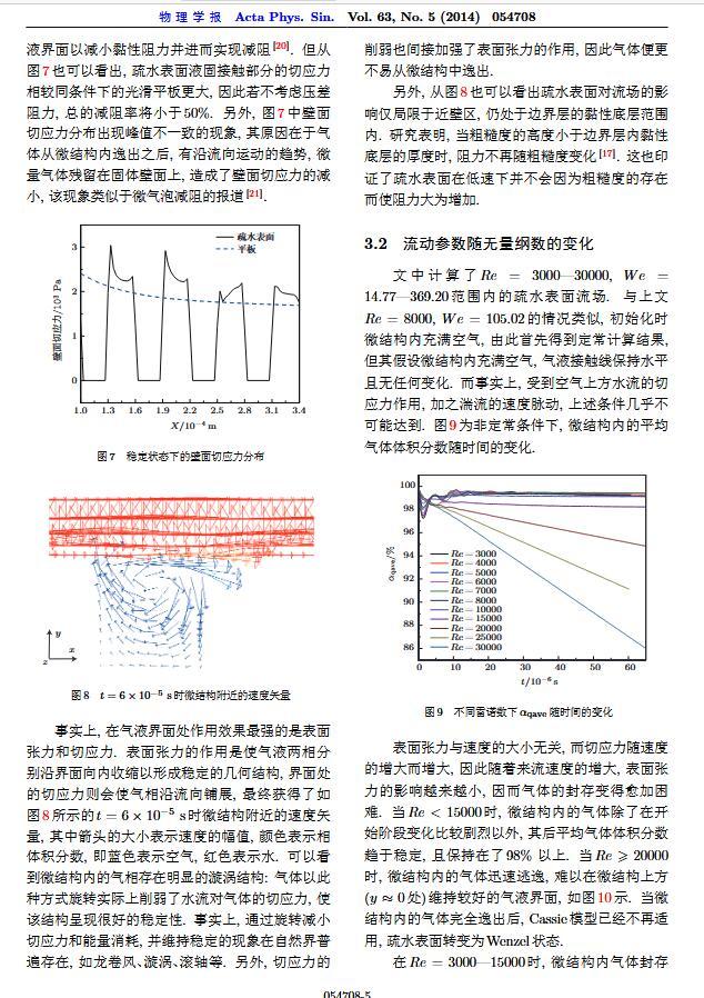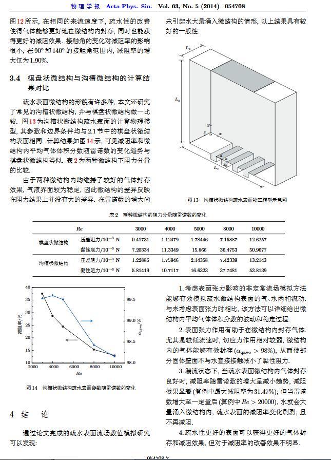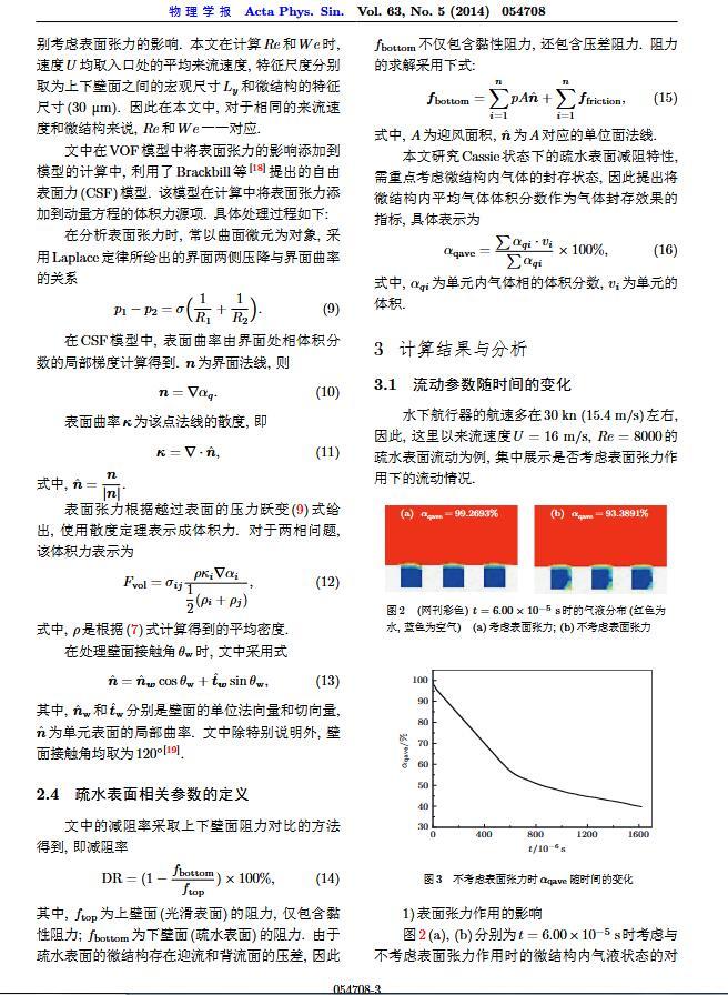 通過構(gòu)造具有棋盤狀微結(jié)構(gòu)的疏水表面,考慮表面張力的影響,利用定常與非定常結(jié)合的數(shù)值模擬方法,研究了疏水表面在湍流狀態(tài)下的減阻特性以及微結(jié)構(gòu)內(nèi)氣體封存的效果,其中Re=3000—30000.在低雷諾數(shù)下,疏水表面微結(jié)構(gòu)內(nèi)氣體封存狀態(tài)良好,減阻率最高約為30%;隨著雷諾數(shù)的增大,壓差阻力增大,減阻率有下降趨勢(shì).當(dāng)來流速度過大時(shí),水會(huì)大量進(jìn)入微結(jié)構(gòu),疏水表面的減阻率變化劇烈,且已經(jīng)不再減阻.結(jié)果表明,表面張力削弱了壁面切應(yīng)力的影響,使得低雷諾數(shù)下微結(jié)構(gòu)內(nèi)氣體能夠有效封存,進(jìn)而減小壁面阻力.