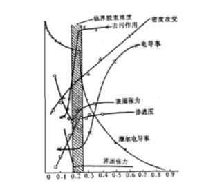 臨界膠束濃度的英文表達為:Critical Micelle Concentration,可縮寫為CMC。自從Mcbain于1925年首次提出膠束(團)的概念,認為當濃度升至一定值時,肥皂分子在水溶液中從單體締合為“膠態(tài)聚集態(tài)”,并稱之為“膠束”或“膠團”(圖1)。所形成的這些膠束是熱力學穩(wěn)定的,從而將形成膠束時的濃度稱為臨界膠束濃度,簡稱為CMC。含有表面活性劑溶液體相中一旦形成了膠束或膠團后,溶液體相的一系列性質會發(fā)生改變(圖2),例如摩爾電導率、表(界)面張力、去污力、滲透壓以及增溶、吸附量等突變是因為溶液體相中出現了表面活性劑聚集態(tài),這些性質的變異通常都發(fā)生于一個窄濃度范圍,而將這個窄濃度范圍定義為臨界膠束濃度,獲取的方法就是將CMC兩側溶液性質連續(xù)變化的曲線延長至相交,交點所對應的濃度為CMC。
