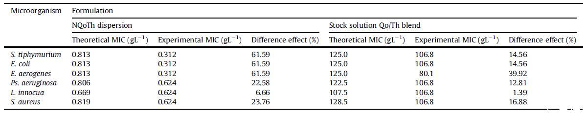 本研究的一個(gè)目標(biāo)是確定對(duì)微生物的影響是否是由于組分的協(xié)同或相加作用。通過根據(jù)NQoThs中存在的百分比(QoLMW為75%,Th為25%)對(duì)QoLMW和Th的MIC進(jìn)行加權(quán),將NQoThs的MIC與附加效應(yīng)的估計(jì)值進(jìn)行比較。NPs(NQoTh)和QoLMW/Th原液的MIC值均低于基于組分加和效應(yīng)估計(jì)的MIC,表明Qo和Th之間存在協(xié)同效應(yīng)(見表5)。然而,取決于測(cè)試的細(xì)菌,NPs的MIC比庫存QoLMW/Th混合物低大約1.5到4.5倍。Wazed Ali、Rajendran和Joshi(2011)評(píng)估了使用TPP從440-kDa Qo的1.0%(w/v)溶液中產(chǎn)生的NQo(115.5 nm)的AM抗金黃色葡萄球菌。NQo比Qo原液更有效地抑制這些細(xì)菌的生長(zhǎng)50%。