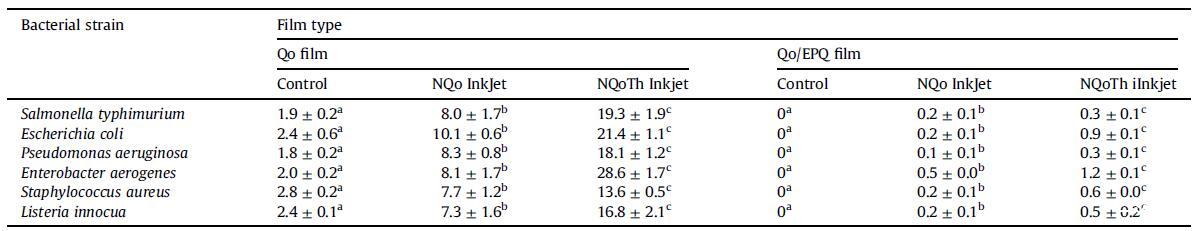 表6通過熱噴墨將NQo和NQoTh結(jié)合到Qo和Qo/EPQ薄膜中的徑向擴(kuò)散的生長(zhǎng)抑制區(qū)(mm2)。對(duì)于每種納米顆粒溶液,薄膜印刷4次。不同字母表示顯著差異(p<0.05)。
