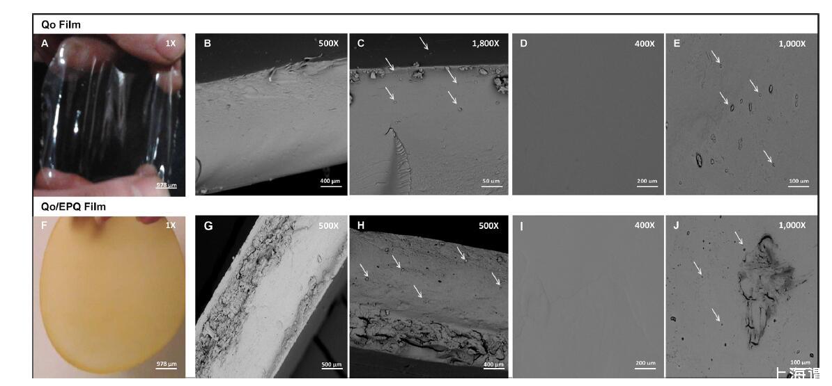 Qo和Qo/EPQ的印刷膜示于圖3A和F。圖3B示出了Qo膜的橫截面,圖3G示出了EPQ/Qo膜的橫截面。Qo膜具有均勻、柔軟、光滑、連續(xù)的結(jié)構(gòu),具有良好的完整性和孔隙。相比之下,混合膜具有帶有孔隙和裂縫的異質(zhì)結(jié)構(gòu)。Qo-乳清蛋白薄膜(Kurek、Galus和Debeaufor,2014年)和Qo-明膠薄膜(Kurek等人,2012年;Rivero、García和Pinotti,2009年;Torres、Aimoli、Beppu和弗雷利希,2005年)。這些作者將這些由碳水化合物和蛋白質(zhì)混合物制備的薄膜的異質(zhì)結(jié)構(gòu)歸因于干燥過程(溶劑前沿的遷移)。Qo/EPQ薄膜的干燥時(shí)間是Qo薄膜的1.8倍,表明水分子通過混合薄膜的擴(kuò)散速度較慢。此外,混合物的pH值(pH 3.8)接近藜麥蛋白的等電點(diǎn)(Abugoch,Romero,Tapia,Rivera,&Silva,2008),這可能會(huì)引發(fā)復(fù)雜的凝聚和某些蛋白質(zhì)組分的沉淀,導(dǎo)致Ferreira等人描述的熱力學(xué)不相容性。(2009),當(dāng)乳清蛋白和Qo的混合物被酸化以獲得混合膜時(shí),他觀察到了這種現(xiàn)象。