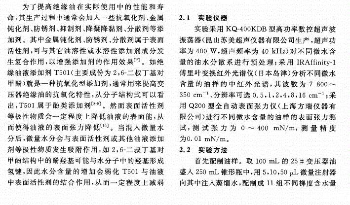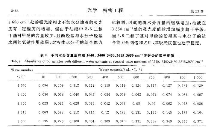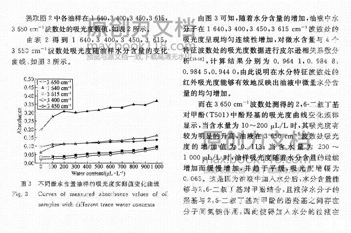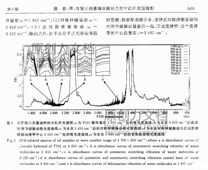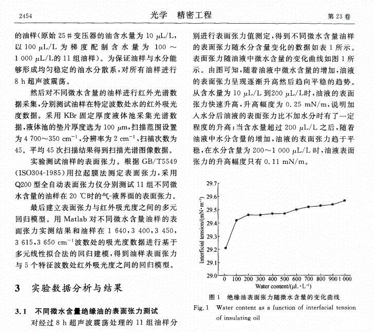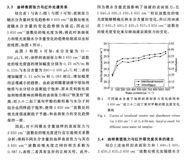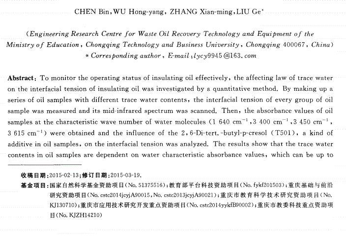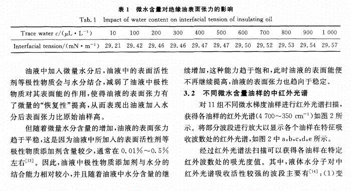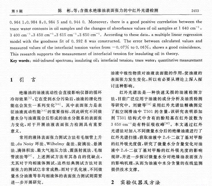 【摘要】:為了有效監(jiān)控絕緣油的運行狀態(tài),采用定量分析方法探討了微量水分對絕緣油表面張力的影響規(guī)律。通過配制不同微水含量的絕緣油樣,對每組油樣進行表面張力測試,然后對油樣進行紅外光譜掃描,獲取了油樣中水分在特征波數(shù)處(1 640,3 400,3 450,3 615cm-1)的吸光度值。分析了油液中2,6-二叔丁基對甲酚(T501)等添加劑對油樣表面張力變化規(guī)律的影響。結(jié)果表明:油樣中水分含量與水分特征吸光度值之間有較好的相關(guān)性(相關(guān)系數(shù)分別為0.964 1,0.984 8,0.984 5,0.944 0),油樣表面張力和1 640,3 400,3 450,3 615,3 650cm-1波數(shù)處油樣吸光度值的變化亦均呈現(xiàn)良好的正相關(guān)性。建立了油樣表面張力與特征波數(shù)處油樣吸光度值的多元線性回歸模型,擬合精度為0.992 8;根據(jù)模型得到的表面張力計算值與實際測量值誤差為-0.07~0.06%,吻合性較好。文中的實驗可為含微水絕緣油的表面張力檢測提供理論支撐。