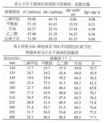 表2為實驗所用小分子液體的表面張力及極性、色散分量,表3為環(huán)氧618-咪唑體系70℃不同固化時刻下的樹脂體系與小分子液體的接觸角。