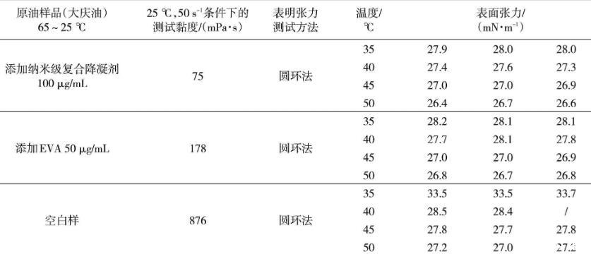 從表1可以看出,處理后添加納米級復(fù)合降凝劑100μg/mL大慶油樣、添加傳統(tǒng)EVA降凝劑50μg/mL大慶油樣、大慶空白油樣在25℃、50 s-1測試條件下的黏度是依次升高的,添加納米級復(fù)合降凝劑100μg/mL的大慶油樣品黏度最低,為75 mPa·s。相同的測試溫度條件下,黏度越大的油樣表面張力越大。其中,空白油表面張力最大,添加傳統(tǒng)EVA降凝劑的油樣次之,添加納米級復(fù)合降凝劑的油樣最小。原油油品的表面張力隨著溫度的降低而增大。