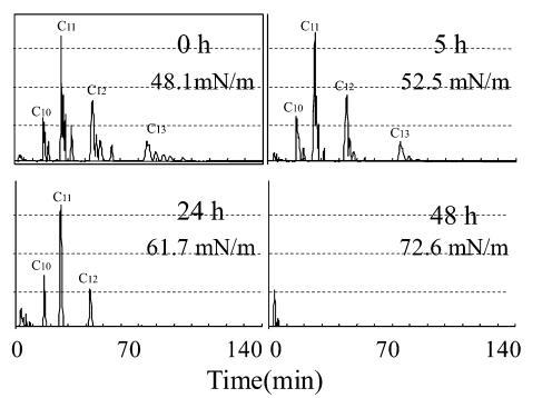用高效液相色譜法分析生物降解過程中AE 的色譜圖如圖8 所示,其中10 毫克/升C12-AE9 的峰出現(xiàn)在11 分鐘的保留時間,作為內(nèi)標(biāo)的C18 醇出現(xiàn)在18 分鐘的保留時間。 在 8 分鐘的保留時間之前觀察到主要由衍生產(chǎn)物引起的干擾峰。 10mg/L AE9 的大部分峰在 48 小時后消失(圖 8),而圖 3 中此時基于需氧量的生物降解保持 35%。此時表面張力值達(dá)到約 72.8 mN/m . 因此,表明AE9在其生物降解率低于50%的時間內(nèi)失去了其界面活性和水生毒性。