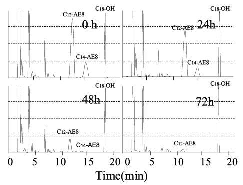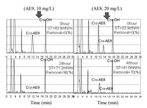 使用商用 AE8 進(jìn)行生物降解測試獲得的結(jié)果如圖 9 所示,其中 C12-AE8 和 C14-AE8 的峰分別在保留時間 11 分鐘和 14 分鐘附近觀察到。 觀察到18分鐘內(nèi)標(biāo)峰和8分鐘前的干擾峰以及圖8中AE9的結(jié)果。24小時后觀察到AE8峰面積減少,72小時峰消失。 144 小時(6 天)后表面張力值達(dá)到約 72.8 mN/m,而生物降解率僅為 45%,死亡率在 48 小時時降至 0%(圖 5)。 與 10 mg/L AE9 的結(jié)果相似,20 mg/L AE8 的水生毒性在基于需氧量的生物降解增加到 50% 之前消失。
