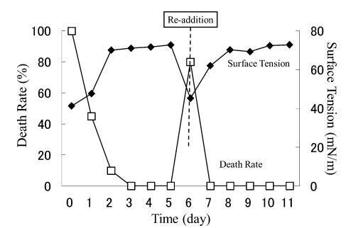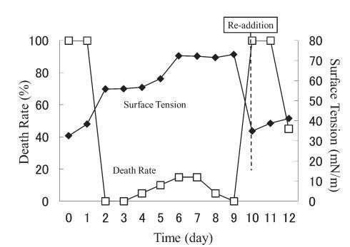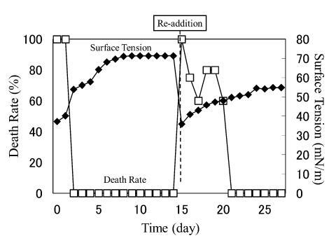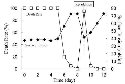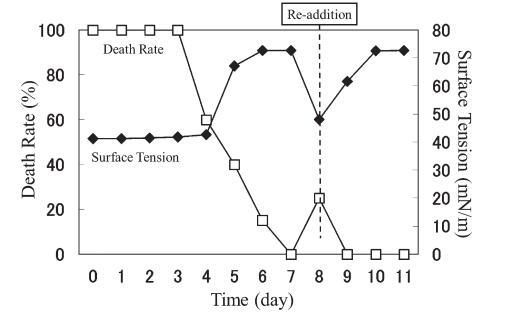 結(jié)果,在第8天重新加入LAS使試液的表面張力降低到與初始階段相同的水平,但死亡率沒有達(dá)到100%。 重新添加后不久,觀察到表面張力值迅速增加,水生毒性和死亡率迅速下降。 重新添加 LAS 后,死亡率暫時增加,但隨后立即降至 0%。 重新添加后第 2 天,表面張力值達(dá)到約 72.8 mN/m。