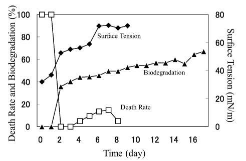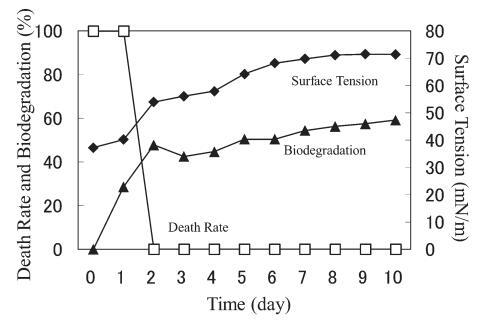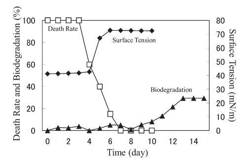 AE 的生物降解速度比 LAS 快。 對于 10 mg/L AE9,BOD 和表面張力值在測試開始后立即開始增加,死亡率立即下降(圖 3)。 表面張力值在第 2 天達(dá)到約 72.8 mN/m。 該結(jié)果與之前的報告一致9),其中比較了基于 CO2 量的生物降解率(測量的 CO2 產(chǎn)量/理論 CO2 產(chǎn)量)和 CTAS 的降低率。 也就是說,Strum 研究中 CTAS 的降低對應(yīng)于我們研究中表面張力值的增加。