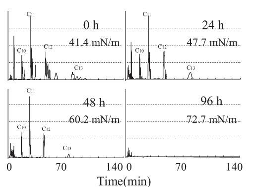 圖 13 馴化試驗(yàn)期間重新添加 20 mg/L LAS 后的色譜圖:描述了重新添加后的時間和當(dāng)時的表面張力。