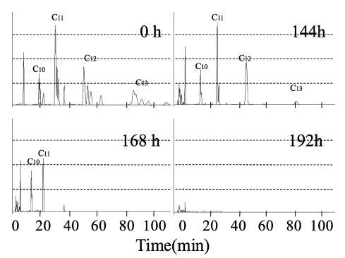 生物降解過程中10mg/L LAS的色譜圖,通過HPLC使用UV檢測器進(jìn)行分析,如圖6所示。在相應(yīng)的保留時間(RT)處出現(xiàn)不同碳鏈數(shù)的峰組:16至19.5分鐘為C10,26.5至32.5分鐘是C11,44到55分鐘是C12,74到95分鐘是C13。 由于苯基的結(jié)合位置不同,每個峰組都包含異構(gòu)體峰。 參考標(biāo)準(zhǔn)(和光純藥工業(yè)株式會社)用于識別每個峰。