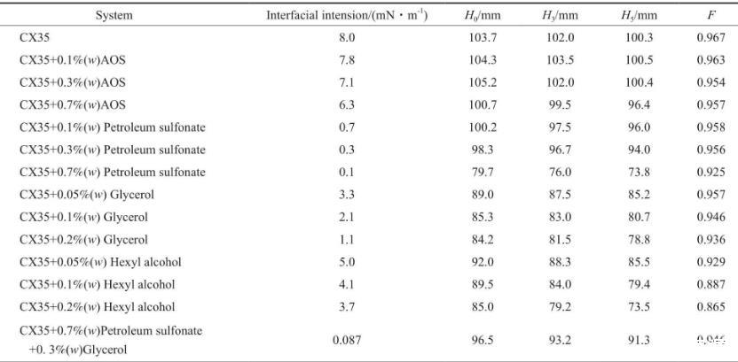 CX35雖具有降低油水界面張力的能力,但加入CX35后,油水界面張力仍大于10-1mN/m數(shù)量級。離子型表面活性劑與醇混合可降低油水界面張力,但醇會影響驅(qū)油劑的起泡性能。不同復配體系的油水界面張力見表1。由表1可看出,石油磺酸鹽降低界面張力的效果尤為突出。這是因為,石油磺酸鹽含苯環(huán)及類苯結(jié)構(gòu),且苯環(huán)上有疏水碳鏈,與原油中的瀝青質(zhì)和芳烴等物質(zhì)結(jié)構(gòu)相似,故石油磺酸鹽易吸附在油水界面上從而降低油水界面張力。同時,石油磺酸鹽還可提高驅(qū)油劑在空隙中的洗油效率,也可通過乳液產(chǎn)生的阻力提高驅(qū)油劑的波及效率。在m(CX35)∶m(石油磺酸鹽)∶m(甘油)=1∶0.7∶0.3的條件下得到的ZX35的起泡高度可達到95 mm以上,穩(wěn)泡能力達到0.946。