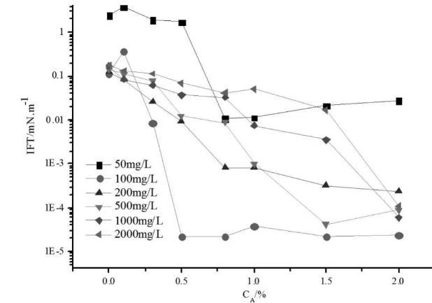 測(cè)定了不同CDEA-12濃度下體系最低界面張力隨堿濃度的變化關(guān)系。