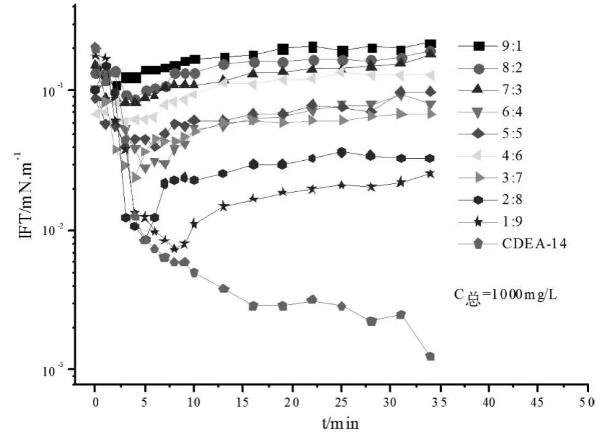 圖1總濃度為1000mg/L CDEA-12和CDEA-14不同復(fù)配比例油水動(dòng)態(tài)界面張力關(guān)系