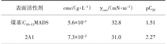 由表1可以看出,2A1的cmc低于C10~13MADS,即形成膠束的能力更強(qiáng),這是由于2A1的親水性低于C10~13MADS,疏水作用強(qiáng),有利于形成膠束。2A1的pC20值大于煤基C10~13MADS,說明2A1在去離子水溶液中降低溶液表面張力的效率高于C10~13MADS。對于碳?xì)滏溞捅砻婊钚詣?,?液界面處的—CH3密度對其表面活性起著很重要的作用,—CH3密度的增大有利于溶液表面張力的降低,同時γcmc值也逐步降低。由表1可以看出,煤基C10~13MADS的γcmc大于2A1,這是由于2A1是采用四聚丙烯得到的支鏈?zhǔn)樵现苽涞?,其疏水鏈的—CH3密度大于煤基C10~13MADS。