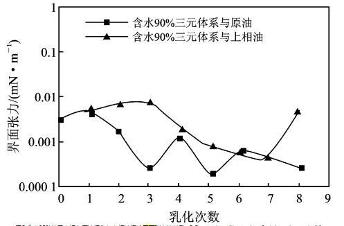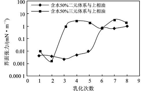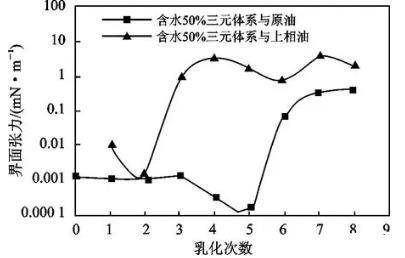 從總體上看,水相與原油間的界面張力低于其與上相油間的界面張力,在乳化第6次以后兩者開(kāi)始趨同。說(shuō)明乳化會(huì)導(dǎo)致油相中的組成發(fā)生變化,進(jìn)而導(dǎo)致油相性質(zhì)發(fā)生變化。因此在復(fù)合驅(qū)驅(qū)替的適當(dāng)時(shí)機(jī)應(yīng)對(duì)驅(qū)油體系的配方進(jìn)行相應(yīng)調(diào)整。