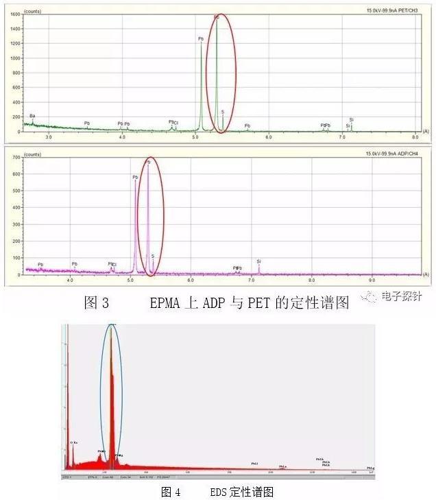 結(jié)果顯示無論是EPMA-1720上的ADP晶體還是PET晶體,其分辨率都毫無疑問地能把S Ka(特征波長(zhǎng)0.5373nm)和Pb Ma(特征波長(zhǎng)0.5285nm)明顯的區(qū)分開來,呈現(xiàn)的是分開的兩個(gè)峰,見圖3中的紅色線內(nèi)。而相同測(cè)試條件下的EDS譜圖中S Ka峰(特征能量2.308keV)已然不能使用軟件自動(dòng)識(shí)別標(biāo)出,手動(dòng)添加的結(jié)果見圖4,其與Pb的Ma峰(特征能量2.343keV)重疊在一起,不能分開。