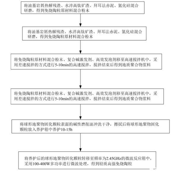 本發(fā)明一種油基巖屑-高鈦礦渣-赤泥基輕質(zhì)高強(qiáng)免燒陶粒及其制備方法,本發(fā)明使用油基巖屑熱解殘?jiān)?、水淬高鈦礦渣、拜爾法赤泥作為免燒陶粒的主要原材,能夠促進(jìn)其地質(zhì)聚合反應(yīng)的發(fā)生,增強(qiáng)對油基巖屑?xì)堅(jiān)鼉?nèi)重金屬離子的固化;