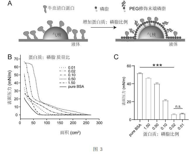 不同蛋白質(zhì)與磷脂質(zhì)量比對氣液界面表面張力調(diào)控效應(yīng)圖:A為牛血清白蛋白與磷脂在氣液界面組裝的示意圖;B為不同蛋白質(zhì)與磷脂質(zhì)量比的氣液界面表面壓力與面積等溫曲線圖;C為不同蛋白質(zhì)與磷脂質(zhì)量比的表面張力值;